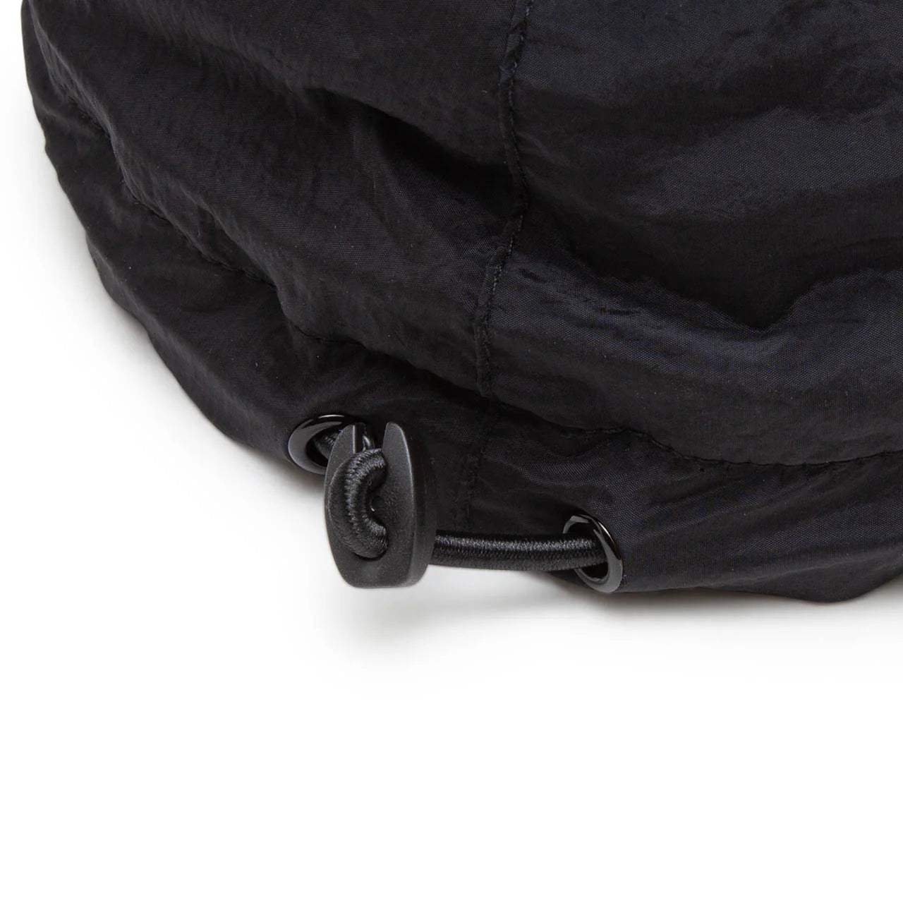 Чорна шестипанельна бейсболка виконана з переробленого нейлону. Передню частину прикрасили вишитим логотипом бренду. Розмір регулюється за допомогою еластичної куліски ззаду.