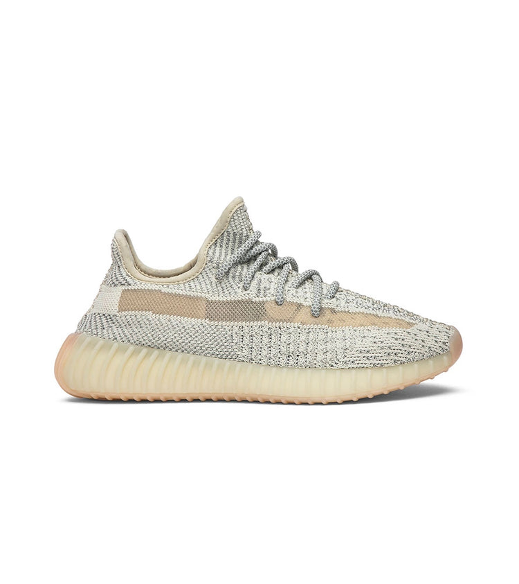 Як і багато попередніх моделей, Yeezy 350 V2 Beige мають прозору смужку через всю боковину. Візерунчастий трикотаж Primeknit також з'явився на цій парі у відтінках брудно-коричневого та кремового.