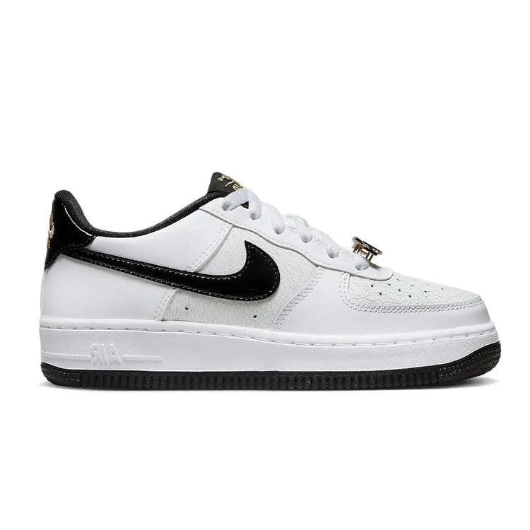 Контрасту з безбарвною основою додають чорні шиповки, язичок, підкладка для шкарпеток та п'ятка. Розкішним завершальним штрихом цієї моделі Air Force 1 Low GS є розкішна мереживна шнурівка кольору металік з чорного золота та чорного мережива, що має форму чемпіонського поясу. Все це на м'якій проміжній підошві Air з міцною підошвою.