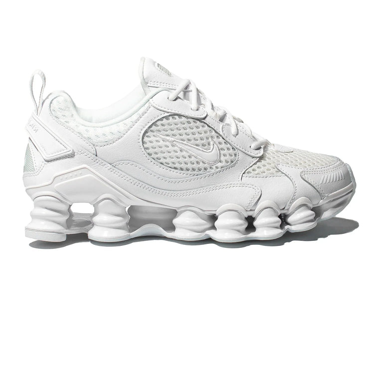 Повертаючись до естетики початку 2000-х, Nike Shox TL Nova має оновлені колодки Shox та п'яткову пластину TPU для м'якої, підтримуючої ходьби. Потрійний білий колір дозволяє зосередити увагу на механічній конструкції кросівок, залишаючи дихаючу сітку верху, пінопластову підошву та формовані накладки в білому кольорі.