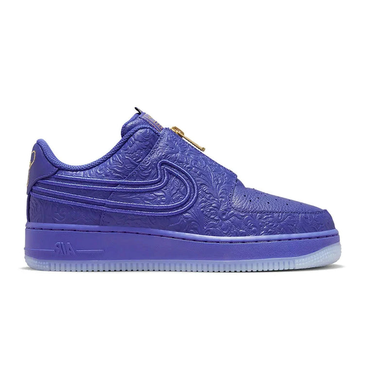 Ця спеціальна версія Air Force 1 прикрашає типовий гладкий верх кросівок стильним рельєфним візерунком "пейслі". Класичні шнурки замінені на золотисту застібку-блискавку, яка фіксує плюшевий язичок внизу кросівок.