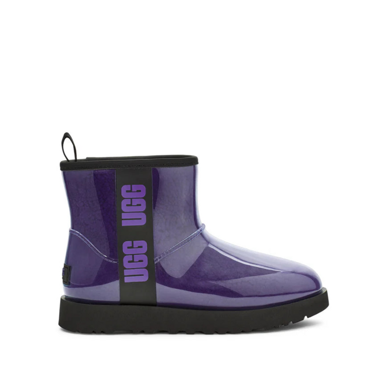 Тепла всередині і водонепроникна зовні, наша модель Classic Clear Mini дає вам найкраще з обох світів і витримає будь-яку зливу. Оновлена культова оригінальна модель, ця нова водонепроникна модель Classic поєднує в собі моду, функціональність і відчуття - все в одному. Легкі та стійкі до погодних умов при температурі до -20 ͦC, вони ідеально підходять для дощових днів у місті, пропонуючи затишок, який ви можете побачити завдяки напівпрозорому водонепроникному верху з кучерявої штучної овчини, нашій фірмовій вовняній підкладці UGGpure™ та знімній устілці з UGGpure™.